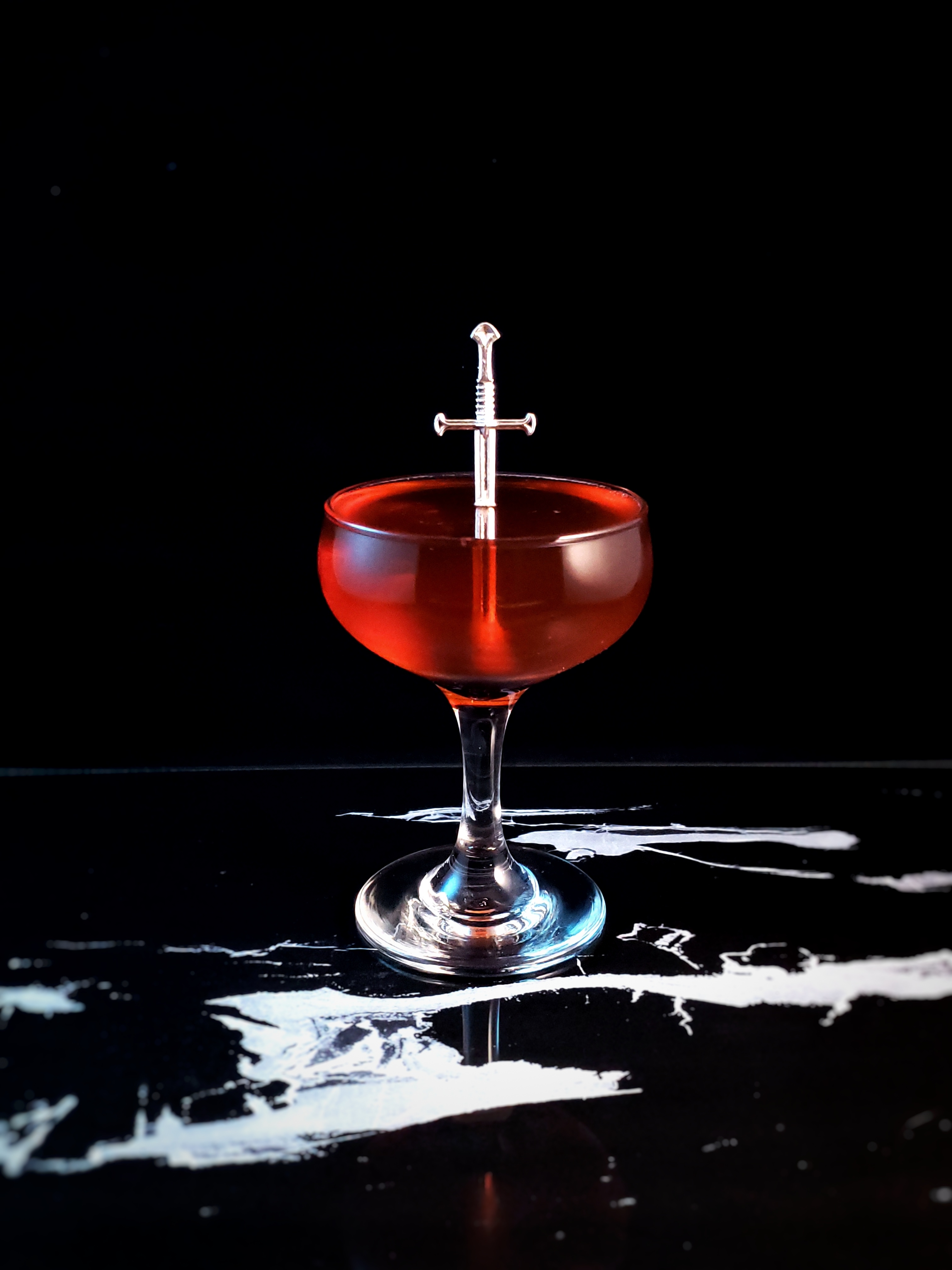 For the name I wanted to include some nod to the pits or the stone fruit of the liqueur. Obviously I arrived at using ‘stone’, and to accompany that I chose ‘rose’, not only for the color, but to acknowledge the inclusion of the apple brandy, as apples are pome fruits that are in the rose family (botany research!). Of course, that just sounded like something out of Camelot, hence the sword piercing the cherry at the bottom.